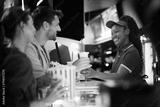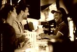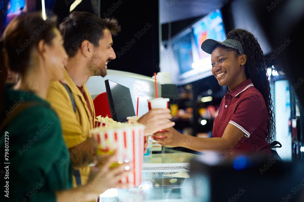 Happy black cahier selling drinks and popcorn to couple in cinema.