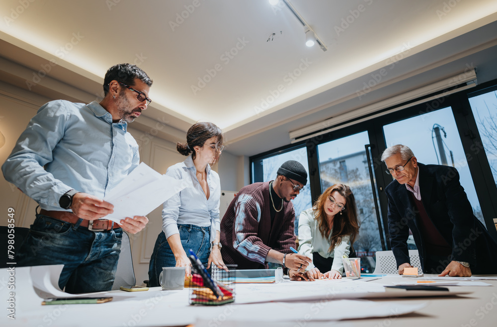 A multigenerational group of business colleagues focused on planning during a collaborative meeting in a well-lit office setting.