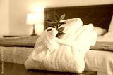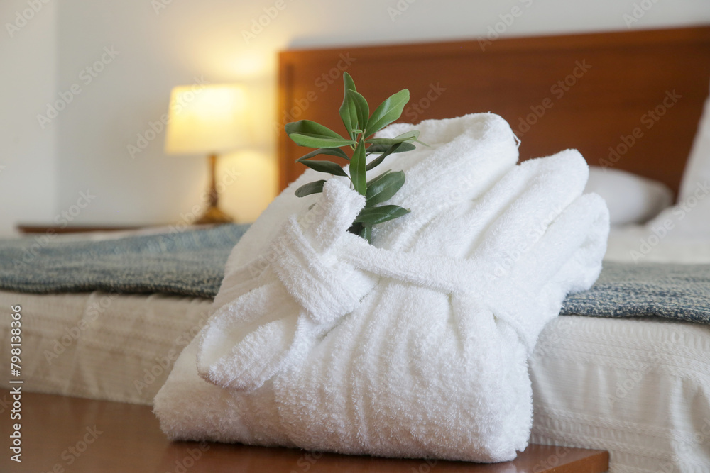 White cotton bathrobe with olive tree twig on the bed in hotel room. Tourism, hotels, hospitality industry