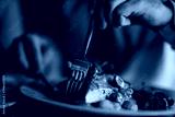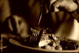 Close-up image of people's hands cutting a dish while they having lunch at a restaurant