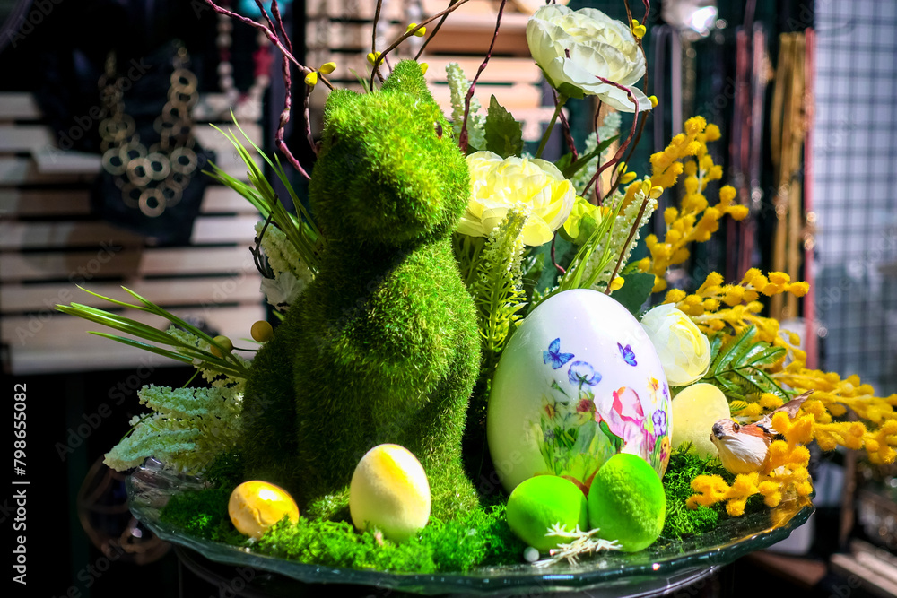 Easter composition. Green hare made of grass and Easter eggs on a tray.