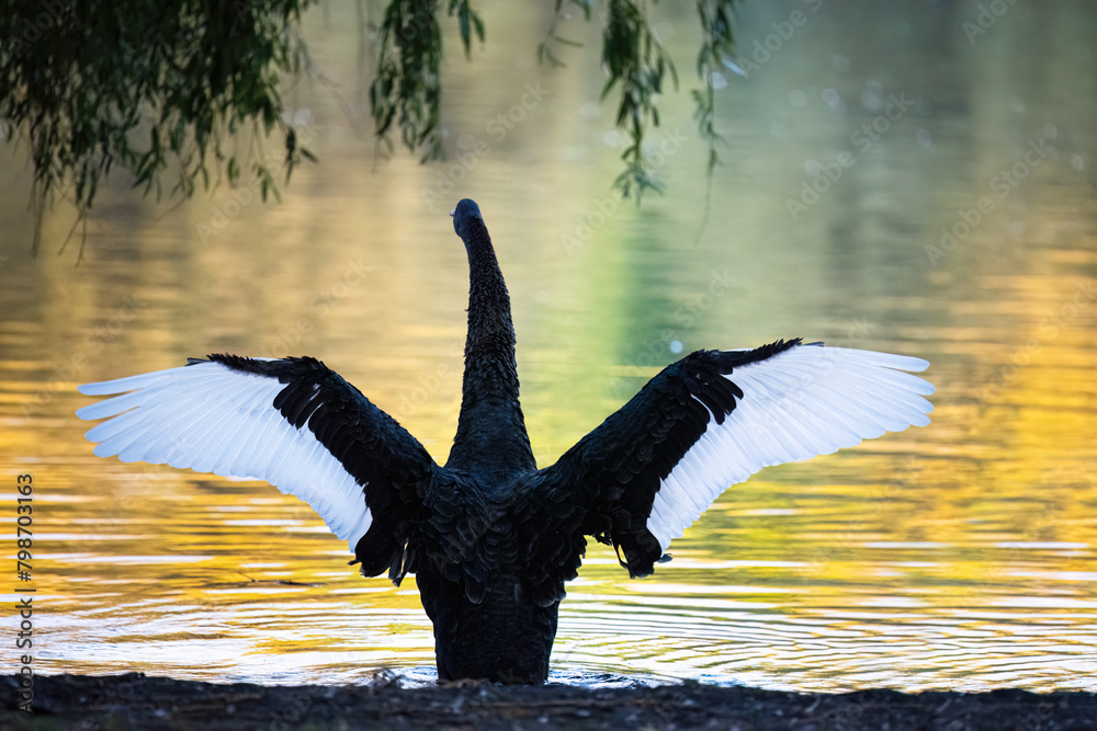 A black swan splashing with wings wide open. Autumn leaf colour reflected in the water. Western Springs Park. Auckland.