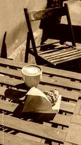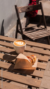 French breakfast with hot cappuccino coffee and freshly baked croissant served on the table in the cafe terrace. takeaway meal food, morning sun light