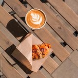French breakfast with hot cappuccino coffee and freshly baked croissant served on the table in the cafe terrace. takeaway meal food, morning sun light