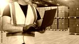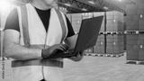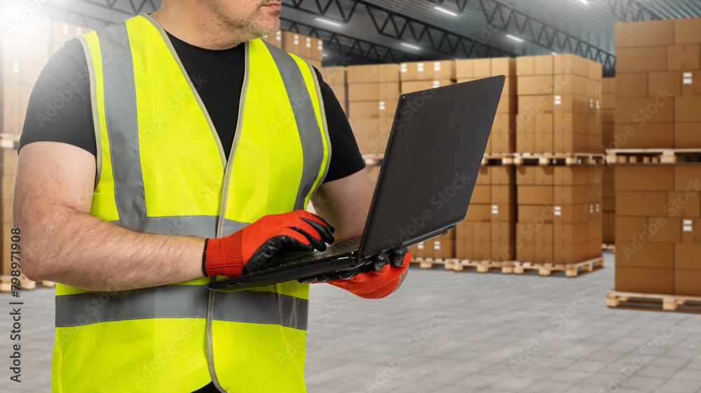 Man warehouse supervisor. Logistician with laptop in hands. Cropped supervisor near pallets with boxes. Man worker in warehouse building. Supervisor stands in hangar for logistics center