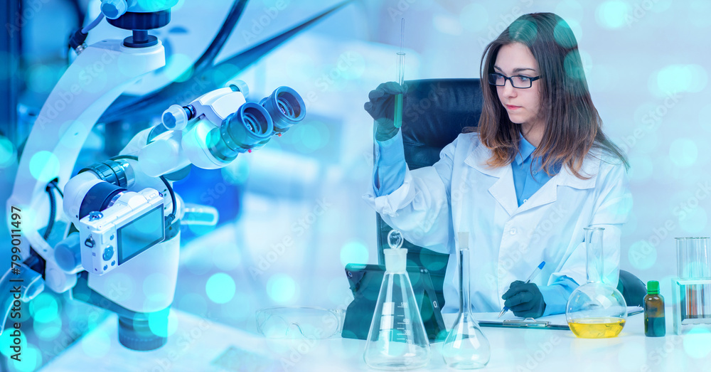 Woman chemist. Scientist near electron microscope. Chemist holds test tube with reagents. Laboratory assistant works sitting at table. Woman chemist in white coat. Scientific research activities