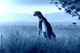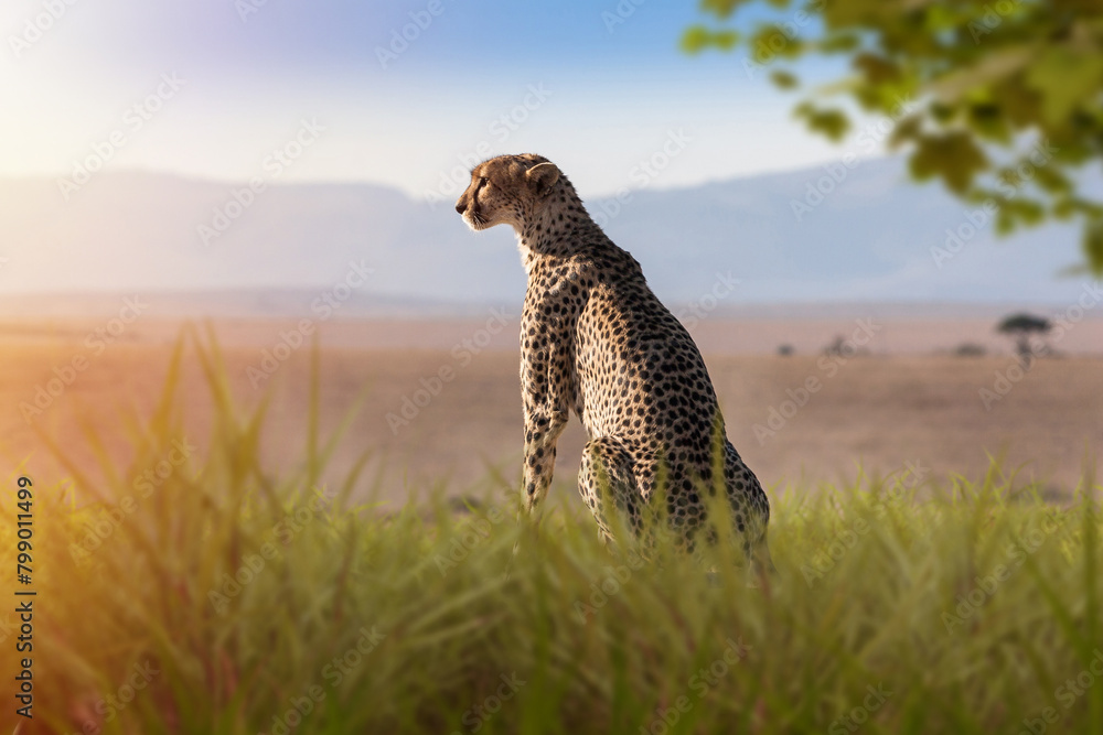 Cheetah sits in grass. Predator watches for prey. Cheetah in African shroud. Wild cat against background nature. Predator living in Kenya. Spotted cheetah in nature park in Africa.