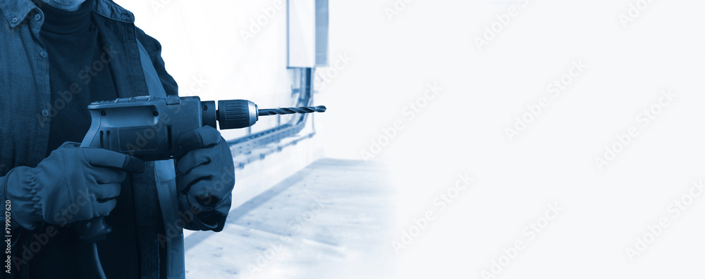 Electric drill in hands of master. Repairman with working tools. Electric drill for installation work. Copy space on white. Cropped electrician works with drill. Equipment for wall mounting