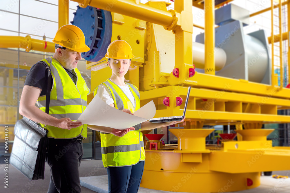 Teamwork factory employees. Man and woman near industrial equipment. Two engineers discuss construction of plant. Manufactory builders with papers in their hands. Factory engineers in yellow vests