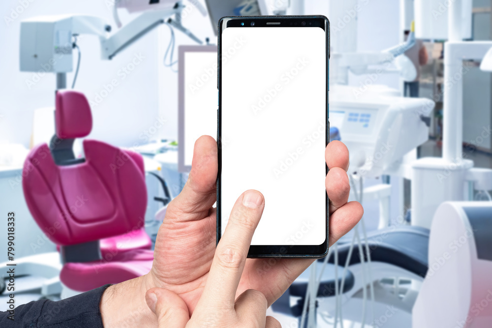 Dental office. Phone with white screen. Equipment for dental treatment. Smartphone in hands. Dental services. Space for advertising dentist on phone. Orthodontist office. Mock up, template