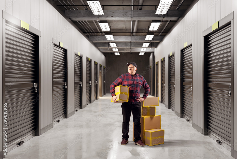 Self storage units. Man in warehouse hallway. Gates to self storage units are closed. Guy rents place for safekeeping. Man with boxes. Rent storage units. Human in building for safekeeping