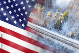 Winter in USA. Road is covered with snow. Flag of united states. Highway in forest. Winter season in USA. Nature of Utah. Abnormal cold from USA. Road and forest view from above. Winter landscape