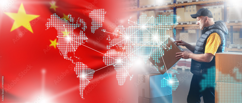 Logistics of goods in China. Man is logistician. Flag of China. Guy works in logistics warehouse. World map with locations of branches of Chinese company. Man doing business with China concept