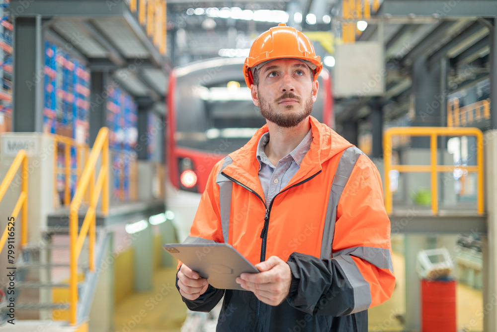 Portrait of a male engineer Take care of the electric locomotive maintenance shop
