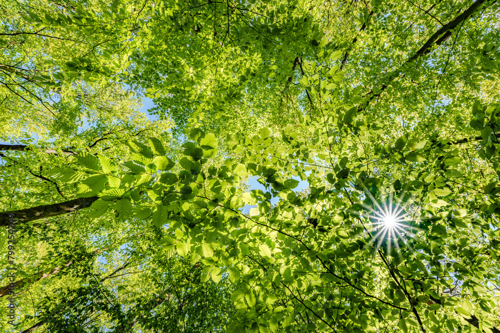 a view up into the trees direction sky - sustainability picture - stock photo - sunstar