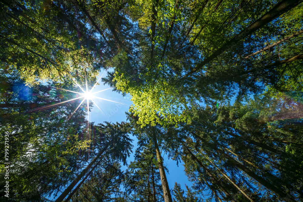 a view up into the trees direction sky - sustainability picture - stock photo - sunstar