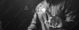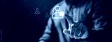 hr, employer, executive, group, headhunter, hiring, human, job, database, crm. A man is pressing a button with a person icon on it. Concept of a person making a decision or taking action.