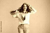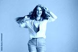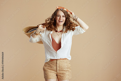 happy stylish woman in blouse and shorts jumping on beige