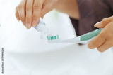 Closeup on young woman squeezing toothpaste on toothbrush