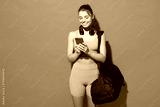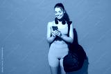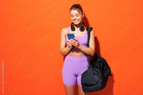 Young fitness trainer instructor sporty woman sportsman wear purple top clothes spend time in home gym hold bag use mobile cell phone isolated on plain orange background Workout sport fit abs concept