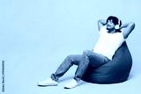 Full body young happy Indian man wear white t-shirt casual clothes sit in bag chair listen to music in headphones isolated on plain pastel light blue cyan background studio portrait Lifestyle concept