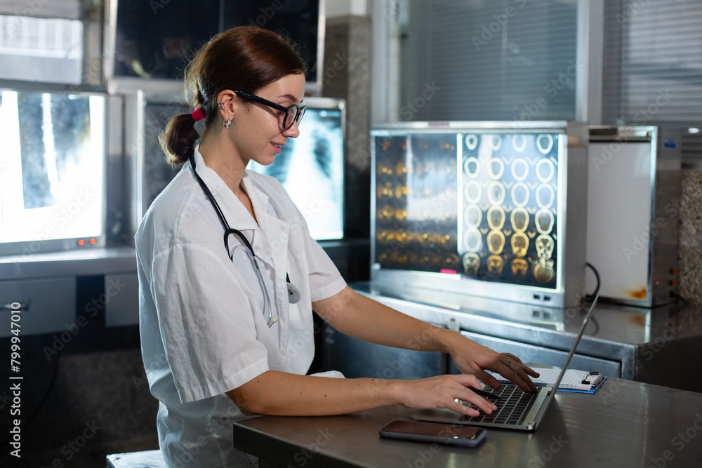 Doctor woman working with laptop check up x-ray film in medical laboratory at hospital. Anatomy diagnostic science of human.