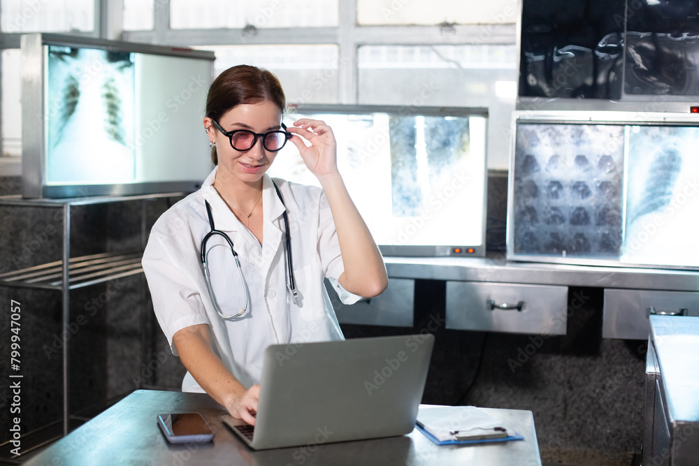 Doctor woman working with laptop check up x-ray film in medical laboratory at hospital. Anatomy diagnostic science of human.
