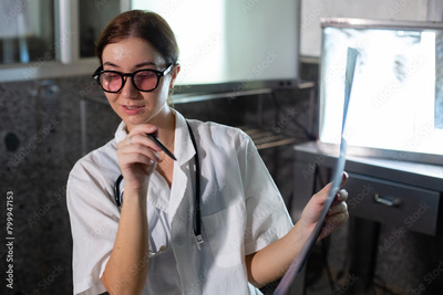 Doctor woman looking check up x-ray film in medical laboratory at hospital. Anatomy diagnostic science of human. woman specialist examining x-ray film in laboratory darkroom.