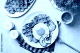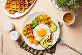 Homemade breakfast or brunch. Fried egg with belgian waffles made with cheese and vegetables, zucchini, onion, carrot, served with avocado and yellow tomato. Cup of coffee drink.