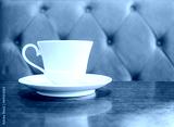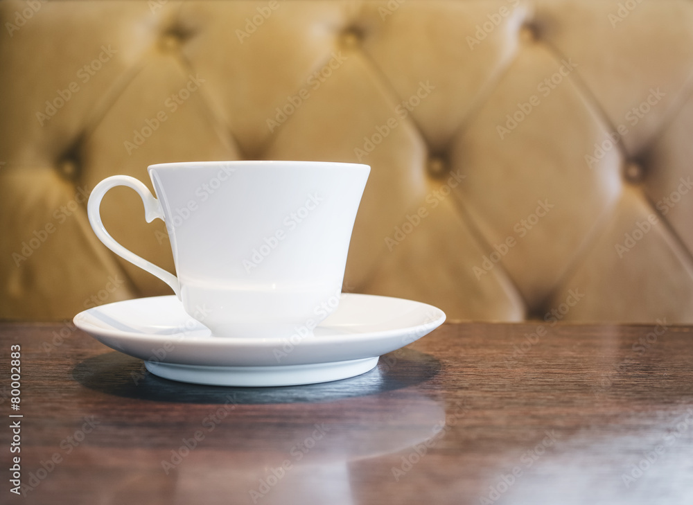 Coffee cup on table in restaurant cafe with sofa background