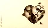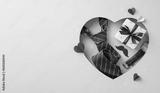 Fathers' Day greetings concept. Top view arrangement of classy necktie, watch, gift box, mustaches, and hearts, in heart-shaped frame on soft blue background with space for text