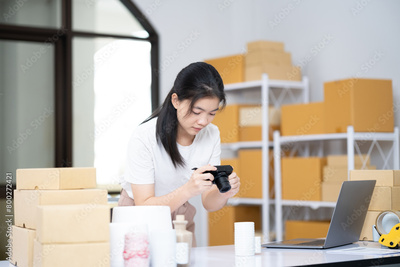 Young Asian business entrepreneur using a compact digital camera take a photo of product for upload to website online shop.