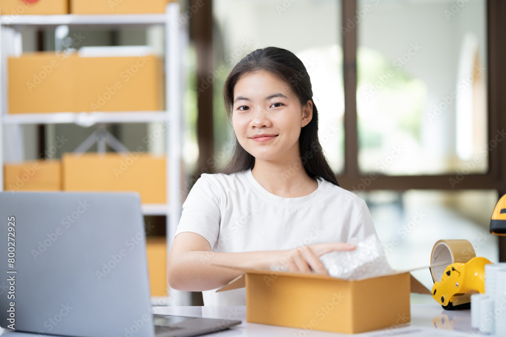 Small business entrepreneur woman packing product in mailing box for shipping from online store. Business online shipping and delivery concept.