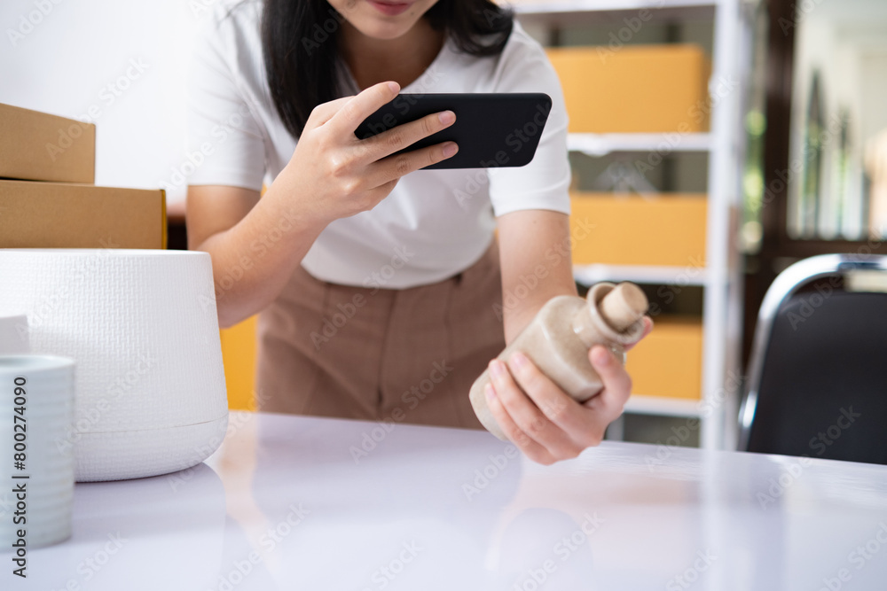 Young Asian business entrepreneur using a smartphone take a photo of product for upload to website online shop.