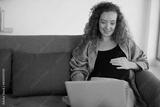 pregnant woman sitting on sofa and working on laptop computer in the office