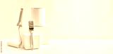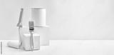 Geometric podium or pedestal with paint can, brush, sponge roller on a white background. Mock up for displaying works