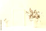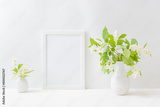 Home interior with decor elements. Mockup with a white frame and white spring flowers in a vase on a light background