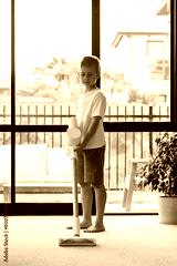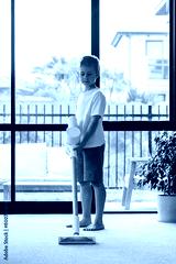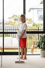 A boy vacuums the living room with a modern wireless vacuum cleaner. Cleaning, wireless technology