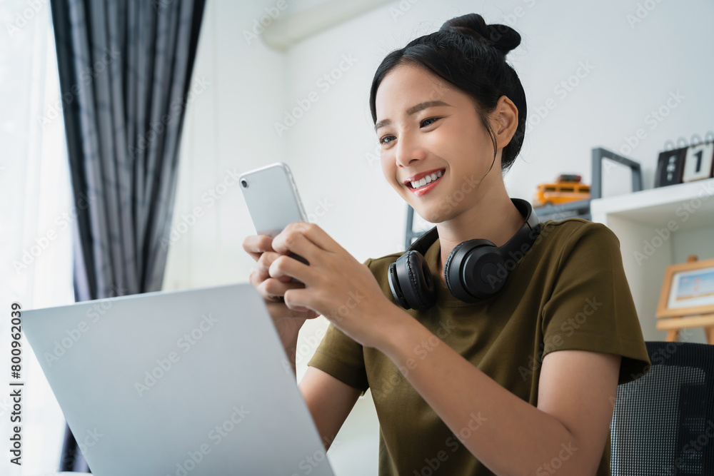 Young beautiful female holding smartphone and using online social media on lifestyle. Technology for communication concept.