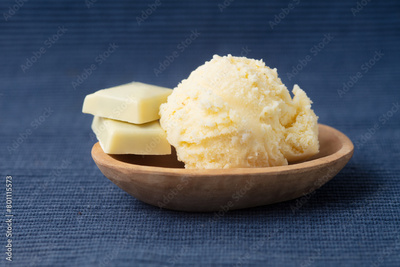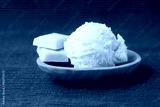Eine Kugel weißes Schokoladeneis in Schälchen aus Holz