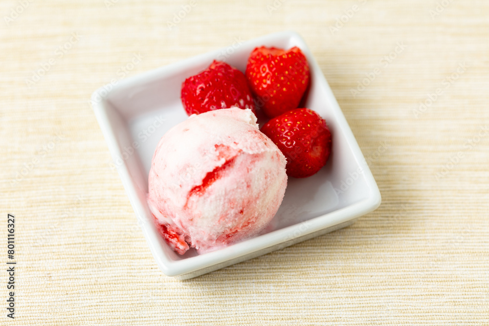 Frische Kugel Joghurteis mit Erdbeeren von oben