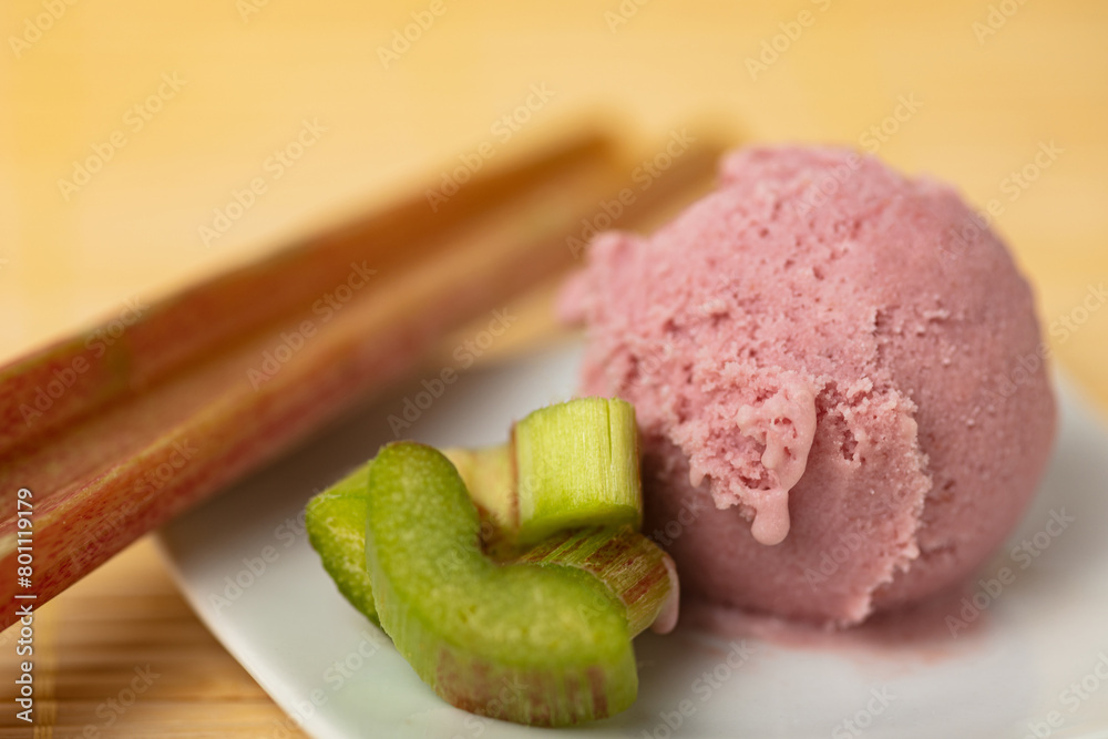Selbstgemachte Kugel Rhabarbereis mit frischem Rhabarber