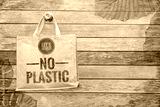 Jute bag with go green logo on wood background with leaves pattern, eco grocery bag with space on old wood wall background