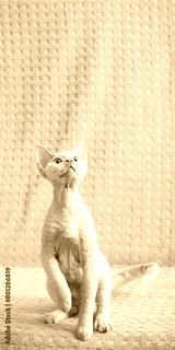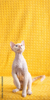 White Devon Rex Kitten Kitty. Short-haired Blue-eyed Cat Of English Breed On Yellow Plaid Background. Shorthair Pet Cat Looking Up.