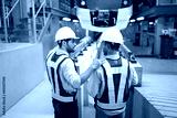 back view engineer talking and looking at high-speed rail or train at construction site