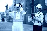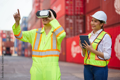 worker or engineer wearing virtual reality glasses(VR) in containers warehouse storage