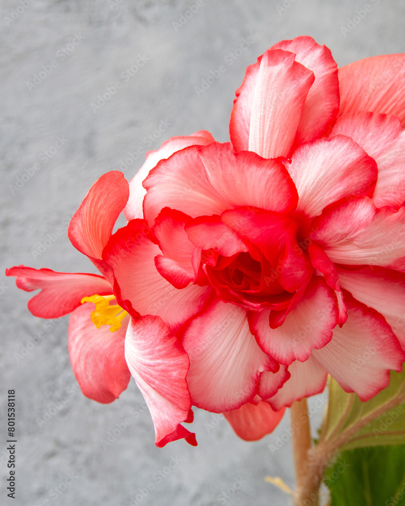 Magnificent lush tuberous white-pink begonia on a light background. Floriculture, hobby, home flowers.