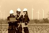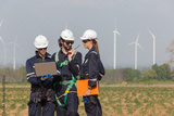 Engineer wearing safety uniform holding laptop discussed plan about renewable energy at station energy power wind. technology protect environment reduce global warming problems.