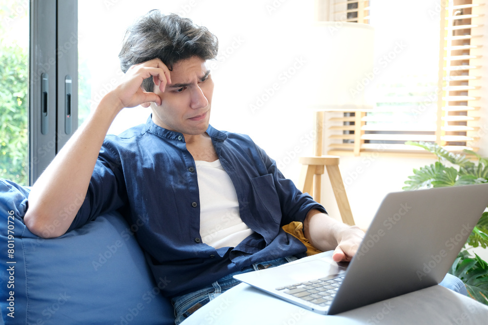Stress man struggle with laptop computer, Frustrated male at home office desk, People struggle with technology, Young male overworked, exhausted and take a break while work from home