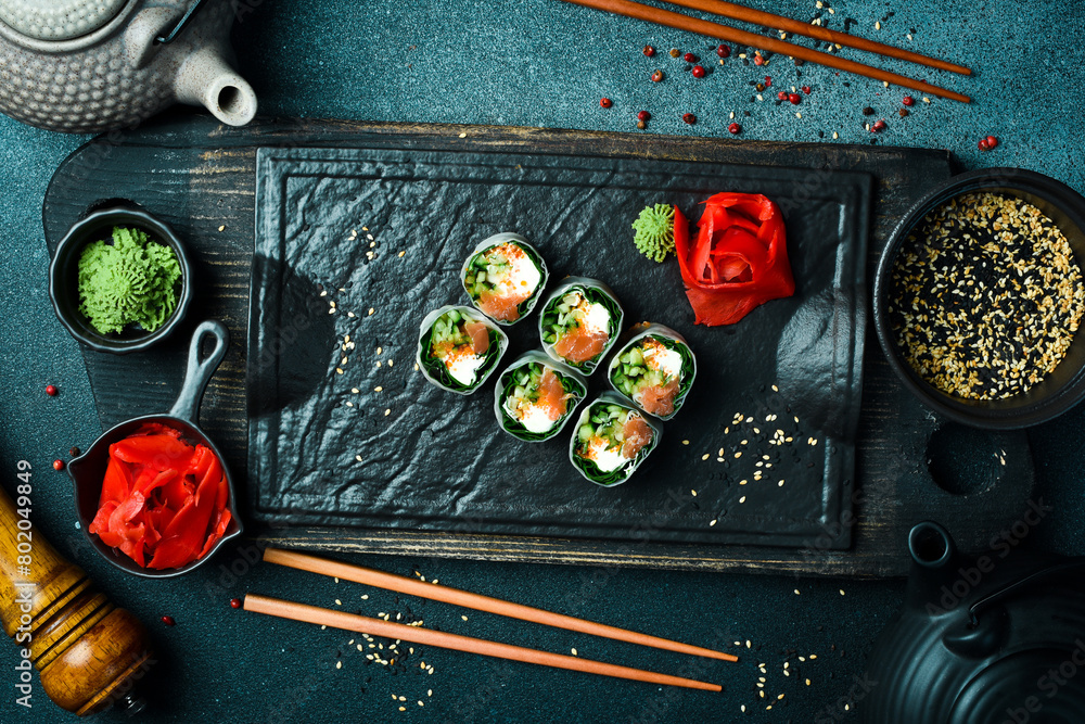 sushi rolls with salmon, kale leaves, and cream cheese. Served with wasabi sauce and pickled ginger. Japanese traditional food. Close up.